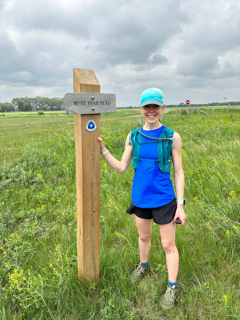 Eventually, I learned how to edit GPX files and submitted what I thought was the appropriate GPX track – that route was approved and, upon approval, I started planning for a FKT attempt that Saturday (I believe I found out it was approved on Wednesday or Thursday that week). Luckily my running partner was supportive and excited, and he agreed to go with me to trail on Friday to get some beta and cache some water. This, however, was where I learned that the GPX file I’d submitted for the route on the FKT website was incorrect – the North Country Trail does go to outer border of the grasslands, but the trailhead to trailhead distance was only 28 miles (the route I’d submitted was 30 miles). A ranger at the trail said that the point I’d marked as the outer edge of the trail was very difficult to get to and, perhaps, impossible to get to in my car. It logically made sense (to me?) that a crossing would be trailhead to trailhead, so I settled on starting at the east trailhead Saturday morning and running West to the West trailhead (and I hoped it wouldn’t cause too much confusion when I submitted my FKT attempt – so I emailed the regional FKT director as soon as I got home to provide an update on the loop).
